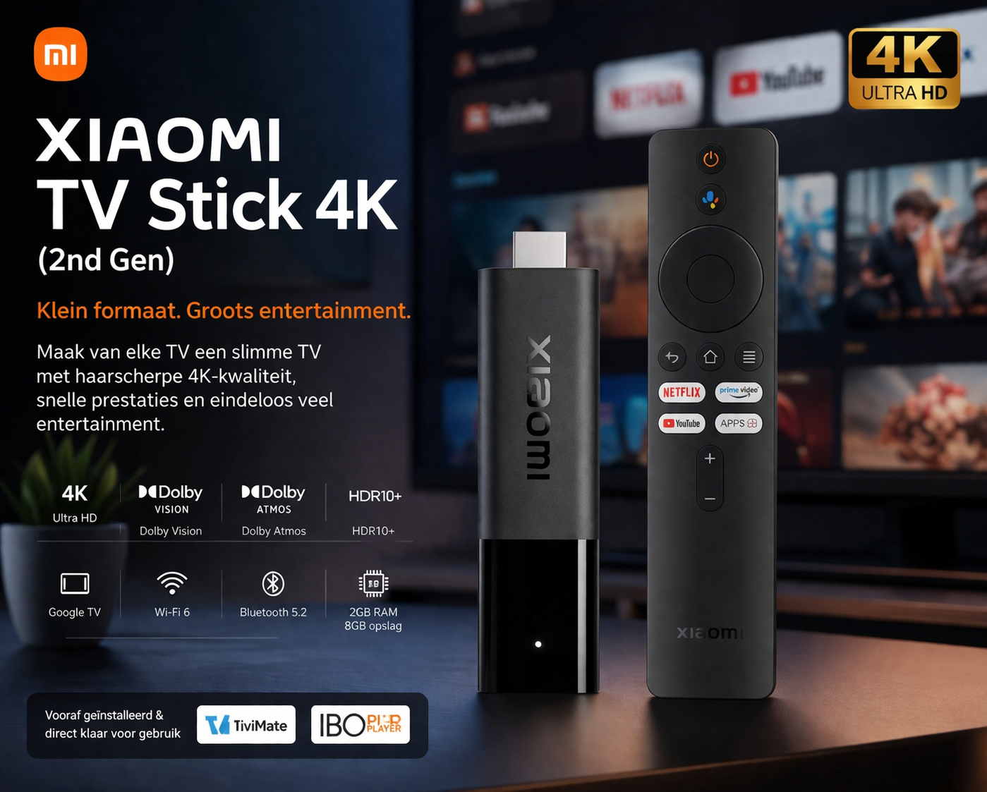 De Xiaomi TV Stick 4K (2nd Gen) is een compacte en krachtige mediaspeler waarmee je eenvoudig apps gebruikt op iedere tv met HDMI. Dankzij het kleine formaat, de snelle werking en nette voorbereiding is dit een ideale oplossing voor wie zonder gedoe wil starten.